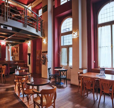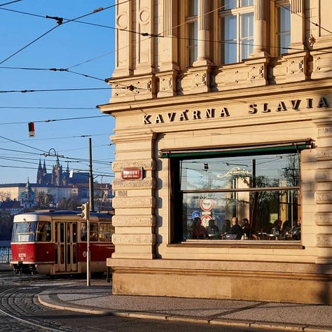 Café Slavia, looking out over the Vltava, warm, wood-lined, perfect for reading. With views of the National Theatre, Charles Bridge and Prague Castle while you sip your hot chocolate or coffee.