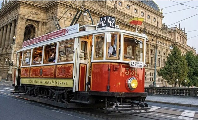 Vintage tram rides on Line 42, a moving postcard travelling past Prague Castle, old streets of Mala Strana, and red roofs.